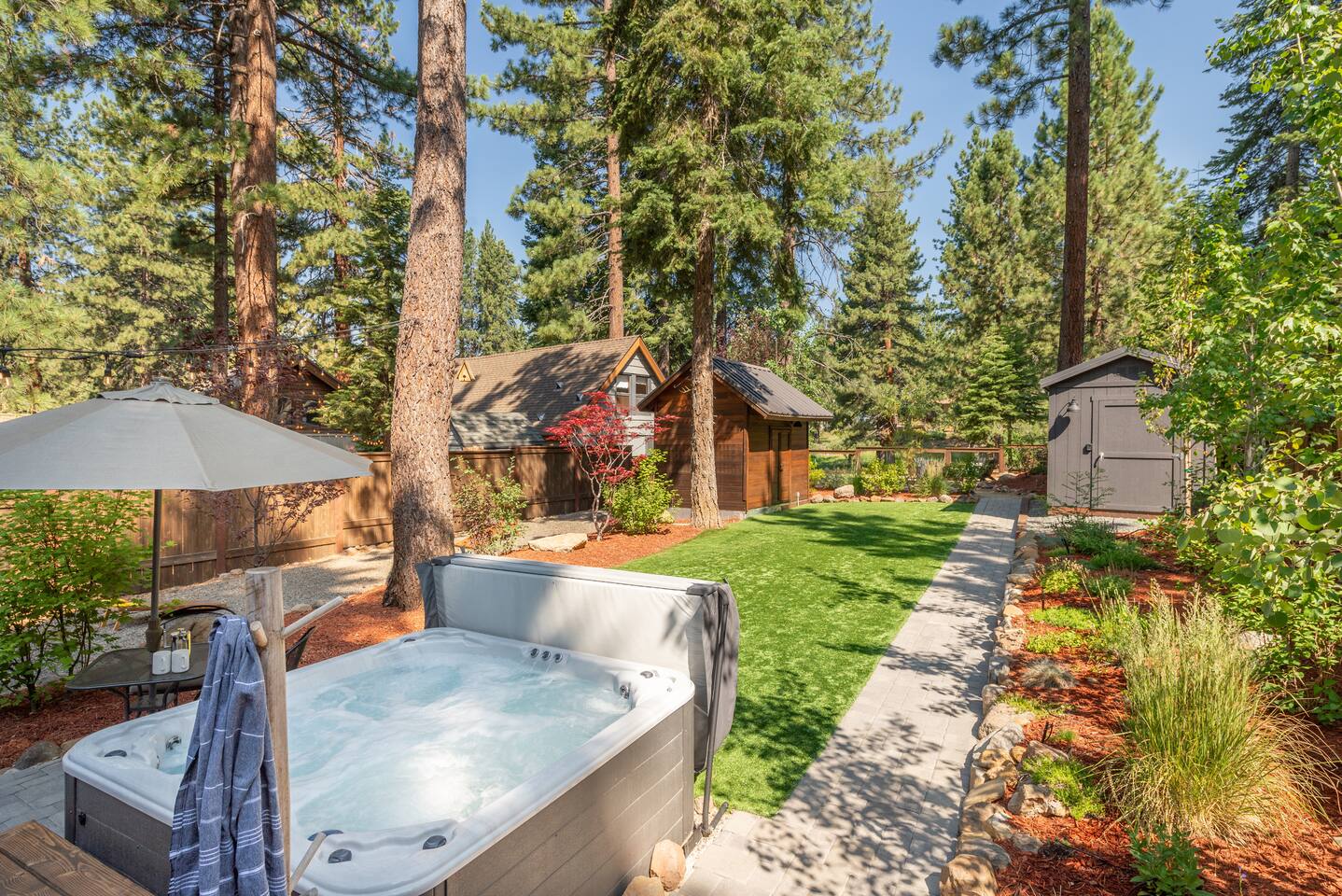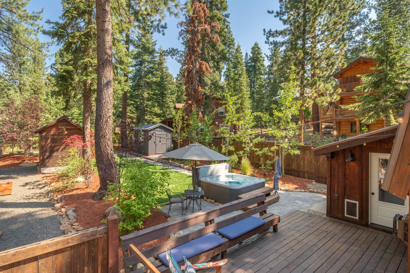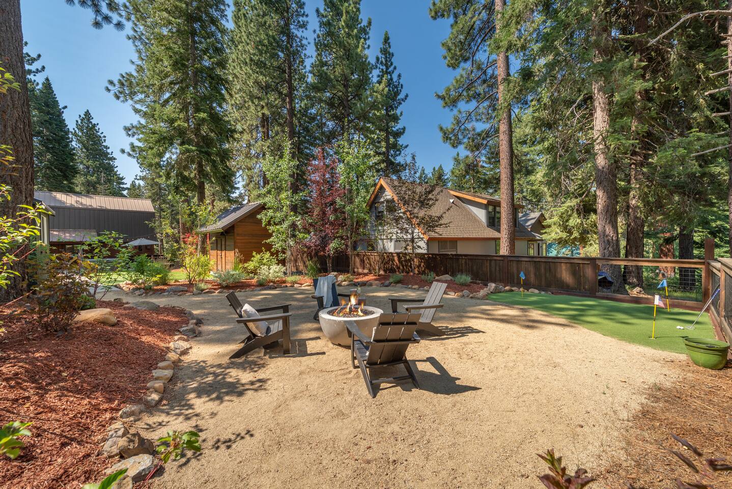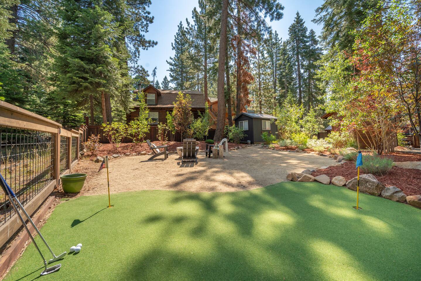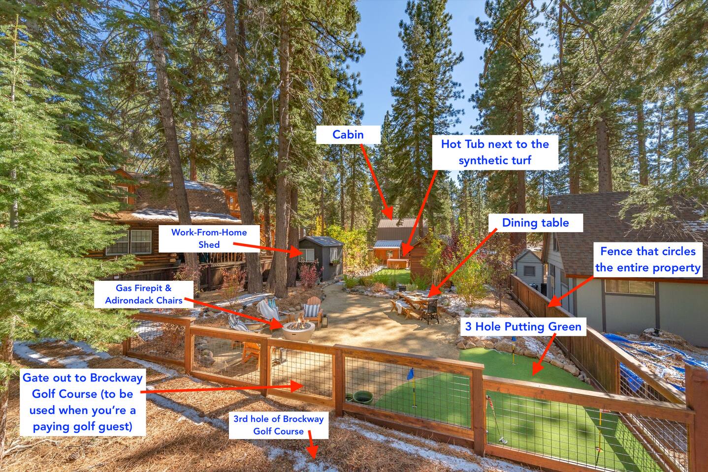 Our family lived in this home for 3.5 years as we remodeled it to prepare it for you, our guest. So there are the luxuries of a vacation rental with the comforts of a thoughtfully updated home. It was originally built in 1947 as a summer cabin on the golf course. Through landscaping and thoughtful updates, this home has been restored to its glory as an enjoyable cabin escape. The quarks of a small cabin are still there, such as VERY uneven floors and narrow staircase, but the comforts of modern living are tucked throughout, including an insulated Work-From-Home office Shed with full desk and cozy infrared space heater. Enter via the front door into the living room, or come around the back to the Mud Room with heated tile floors, washer and dryer, chest freezer, bench, custom shoe rack and plenty of outlets for your boot warmers. Enjoy the cozy living room with Samsung Frame TV (with high speed internet and ACCESS to all your favorite apps. You supply your own log ins, however) and modern gas stove (new in 2020). Dining at the West Elm table is most comfortable for two, but we also supply 2 folding chairs so that 4 people can dine together and a leaf for even more elbow room. The kitchen was fully remodeled in 2019 with quartz counters, full size dishwasher, gas range and giant toddler-bathtub-sized stainless steel sink. Custom uplighting in the open shelving allows you to show off your best wine or whiskey bottles. The under-counter double beverage fridges offer the same capacity as a normal sized fridge, but the small hassle of bending over is the trade off for wide open counter tops for pleasurable cooking prep. Please note that these refrigerators are technically beverage fridges, so they only get down to 39 degrees. They will keep your food safe to eat, but they will not keep veggies crisp as long as a traditional residential fridge will. We are a short walk to Safeway, so we recommend only buying the food you need for a few days at a time. The stairs to the second floor are narrow, but they have been carpeted for comfort and safety. Upstairs you will find both Queen bedrooms and a half bath we lovingly call a "luxury airline bathroom". It is small, but efficient and handy to have a toilet and sink upstairs near the bedrooms. Each room has a queen bed outfitted in comfortable linens. One bedroom has a TV, the other has a full glass sliding door to enjoy views of the snow falling in the neighborhood. Both rooms have blackout curtains for your comfort. Please note that the main heat source is the gas stove downstairs with the heat traveling up through the staircase into the bedrooms. One bedroom has a built in space heater so it can be heated when the door is closed, but the second room does not and will not be heated if the door is closed over night. The only full bathroom is found downstairs and while it is clean and functional, our little bathroom is where the 1940's really shine in this house. The shower is very small and can be a tight fit. Please see the photos in our listing of the shower to decide if it's a good fit for you. The handle is extended well overhead and the shampoo/conditioner/body wash are mounted to the wall to allow the maximum amount of space. We do have an instant hot water heater so at least you can take a nice long hot shower and won't use it all up for your housemates. The yard with hot tub, synthetic turf, putting green, dining area and gas fire pit with Adirondack chairs are a sight to behold. The fire pit and furniture is put away in winter, but we bring it back out as soon as the snow melts. Landscaping and fully enclosed fence were installed in the spring of 2021. Market lights hang over the hot tub for evening soaks, or shut them off for a sweeping view of stars. Please do not use the hot tub after 9pm quiet hours begin. The lawn is synthetic so it is guaranteed to be green and beautiful for your visit (or white and snowy!). The back portion of the yard is decomposed granite with a beautiful view of the 3rd hole and ladies tee of Brockway Golf Course as well as dining table, putting green and gas fire pit with Adirondack chairs (all put away in winter time when there is snow on the ground). The golf course is private property, but there is a gate for you to use if you are a guest of the golf course golfing and want to run into the property for a fresh cocktail :). Our private 3 hole putting green is the perfect spot to practice your putts before walking down to the nearby clubhouse for your tee time. Please note that we do not have a BBQ grill at this property. Also out in the yard is a large insulated Work-From-Home Shed Office. This space is an excellent spot to get "away" and get some work done. There is a large corner desk, comfortable office chair, space heater, wifi extender and plenty of outlets. In the summer, there is no Air Conditioning (pretty much anywhere in Tahoe, actually) so all your neighbors will have their windows open to enjoy the cool night air. That means that every whisper and sound you make outdoors at night carries into everyone's windows. Please respect quiet hours in our sweet, quiet neighborhood. There are fans in each bedroom and the home has new insulation in the roof so it will hold the cool night air through the daytime if you close the insulated curtains first thing in the morning. This same insulation helps keep the cabin cozy and snug through the winter months. We also provide HEPA air filters for the unfortunate "smoke season" we often experience in California. For those few weeks every year where it actually gets into the 80's during the day, it is still cool in the evenings, so the recommendation for Tahoe Cooling is to open all of the windows and shades at night to cool the house down, then close them in the morning to "trap" the cool air inside the house for the day. DOGS (please note: due to allergies we cannot accept any other type of pet): We welcome your pups here, but since this is first and foremost a house