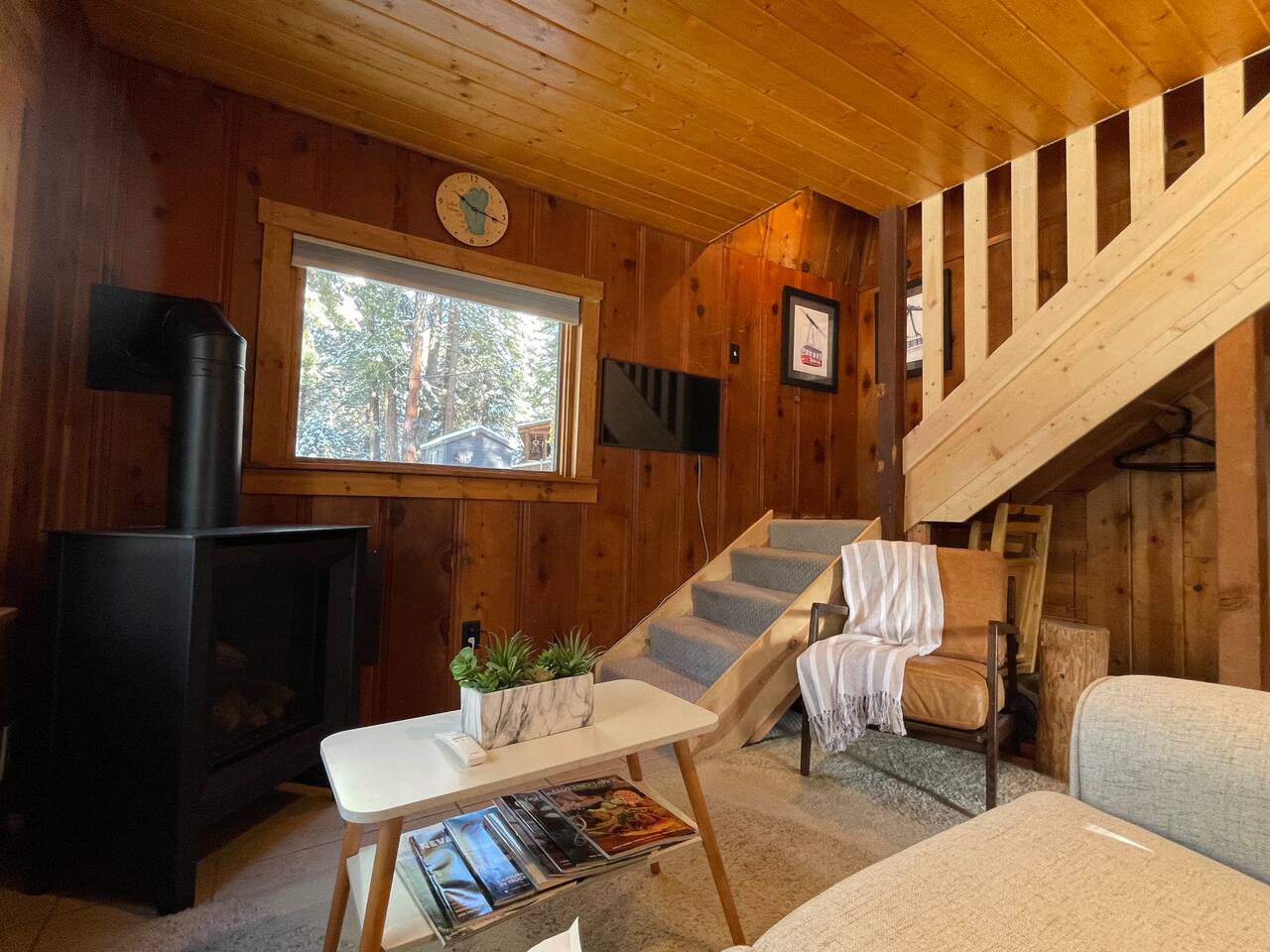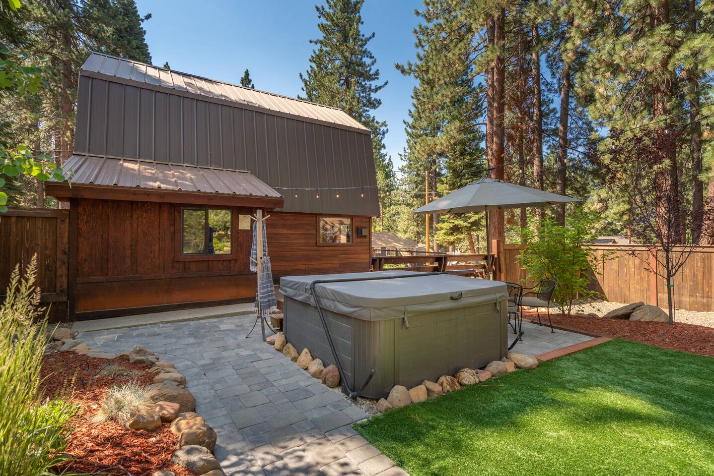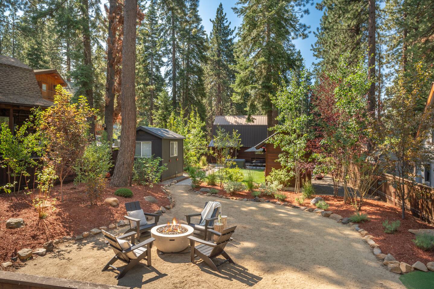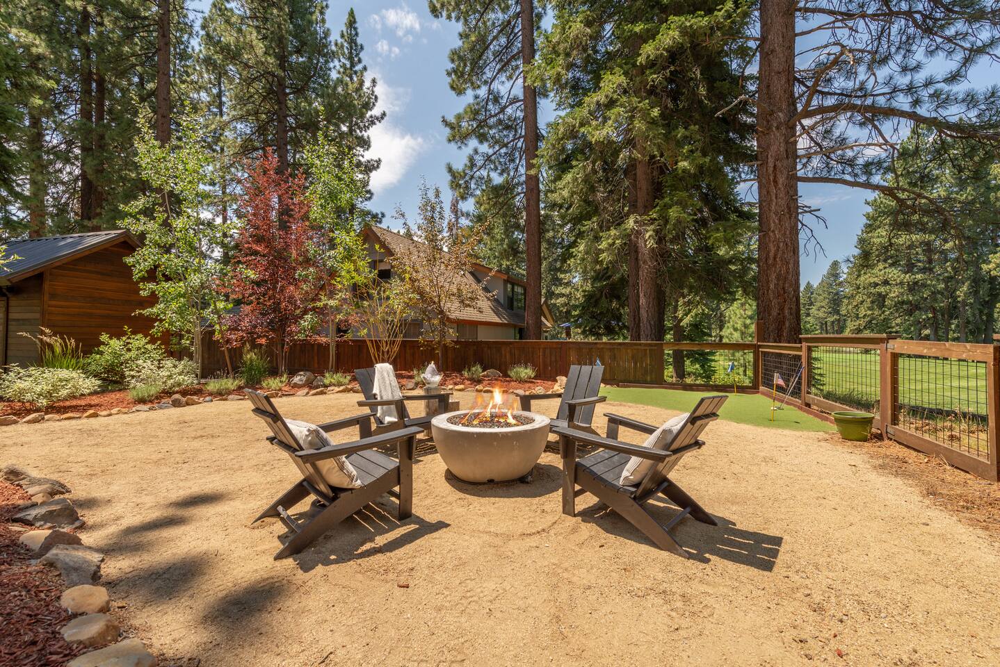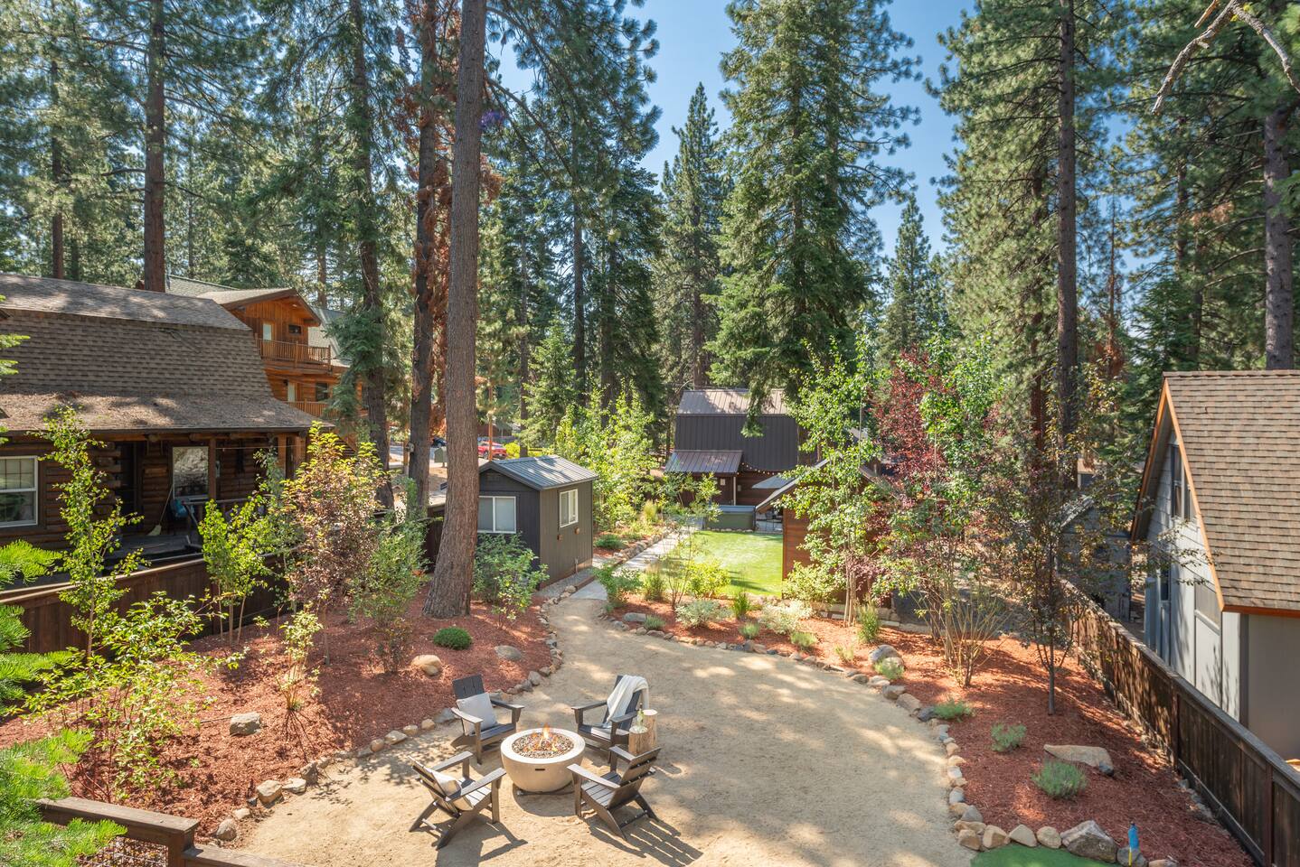 Our family lived in this home for 3.5 years as we remodeled it to prepare it for you, our guest. So there are the luxuries of a vacation rental with the comforts of a thoughtfully updated home. It was originally built in 1947 as a summer cabin on the golf course. Through landscaping and thoughtful updates, this home has been restored to its glory as an enjoyable cabin escape. The quarks of a small cabin are still there, such as VERY uneven floors and narrow staircase, but the comforts of modern living are tucked throughout, including an insulated Work-From-Home office Shed with full desk and cozy infrared space heater. Enter via the front door into the living room, or come around the back to the Mud Room with heated tile floors, washer and dryer, chest freezer, bench, custom shoe rack and plenty of outlets for your boot warmers. Enjoy the cozy living room with Samsung Frame TV (with high speed internet and ACCESS to all your favorite apps. You supply your own log ins, however) and modern gas stove (new in 2020). Dining at the West Elm table is most comfortable for two, but we also supply 2 folding chairs so that 4 people can dine together and a leaf for even more elbow room. The kitchen was fully remodeled in 2019 with quartz counters, full size dishwasher, gas range and giant toddler-bathtub-sized stainless steel sink. Custom uplighting in the open shelving allows you to show off your best wine or whiskey bottles. The under-counter double beverage fridges offer the same capacity as a normal sized fridge, but the small hassle of bending over is the trade off for wide open counter tops for pleasurable cooking prep. Please note that these refrigerators are technically beverage fridges, so they only get down to 39 degrees. They will keep your food safe to eat, but they will not keep veggies crisp as long as a traditional residential fridge will. We are a short walk to Safeway, so we recommend only buying the food you need for a few days at a time. The stairs to the second floor are narrow, but they have been carpeted for comfort and safety. Upstairs you will find both Queen bedrooms and a half bath we lovingly call a "luxury airline bathroom". It is small, but efficient and handy to have a toilet and sink upstairs near the bedrooms. Each room has a queen bed outfitted in comfortable linens. One bedroom has a TV, the other has a full glass sliding door to enjoy views of the snow falling in the neighborhood. Both rooms have blackout curtains for your comfort. Please note that the main heat source is the gas stove downstairs with the heat traveling up through the staircase into the bedrooms. One bedroom has a built in space heater so it can be heated when the door is closed, but the second room does not and will not be heated if the door is closed over night. The only full bathroom is found downstairs and while it is clean and functional, our little bathroom is where the 1940's really shine in this house. The shower is very small and can be a tight fit. Please see the photos in our listing of the shower to decide if it's a good fit for you. The handle is extended well overhead and the shampoo/conditioner/body wash are mounted to the wall to allow the maximum amount of space. We do have an instant hot water heater so at least you can take a nice long hot shower and won't use it all up for your housemates. The yard with hot tub, synthetic turf, putting green, dining area and gas fire pit with Adirondack chairs are a sight to behold. The fire pit and furniture is put away in winter, but we bring it back out as soon as the snow melts. Landscaping and fully enclosed fence were installed in the spring of 2021. Market lights hang over the hot tub for evening soaks, or shut them off for a sweeping view of stars. Please do not use the hot tub after 9pm quiet hours begin. The lawn is synthetic so it is guaranteed to be green and beautiful for your visit (or white and snowy!). The back portion of the yard is decomposed granite with a beautiful view of the 3rd hole and ladies tee of Brockway Golf Course as well as dining table, putting green and gas fire pit with Adirondack chairs (all put away in winter time when there is snow on the ground). The golf course is private property, but there is a gate for you to use if you are a guest of the golf course golfing and want to run into the property for a fresh cocktail :). Our private 3 hole putting green is the perfect spot to practice your putts before walking down to the nearby clubhouse for your tee time. Please note that we do not have a BBQ grill at this property. Also out in the yard is a large insulated Work-From-Home Shed Office. This space is an excellent spot to get "away" and get some work done. There is a large corner desk, comfortable office chair, space heater, wifi extender and plenty of outlets. In the summer, there is no Air Conditioning (pretty much anywhere in Tahoe, actually) so all your neighbors will have their windows open to enjoy the cool night air. That means that every whisper and sound you make outdoors at night carries into everyone's windows. Please respect quiet hours in our sweet, quiet neighborhood. There are fans in each bedroom and the home has new insulation in the roof so it will hold the cool night air through the daytime if you close the insulated curtains first thing in the morning. This same insulation helps keep the cabin cozy and snug through the winter months. We also provide HEPA air filters for the unfortunate "smoke season" we often experience in California. For those few weeks every year where it actually gets into the 80's during the day, it is still cool in the evenings, so the recommendation for Tahoe Cooling is to open all of the windows and shades at night to cool the house down, then close them in the morning to "trap" the cool air inside the house for the day. DOGS (please note: due to allergies we cannot accept any other type of pet): We welcome your pups here, but since this is first and foremost a house