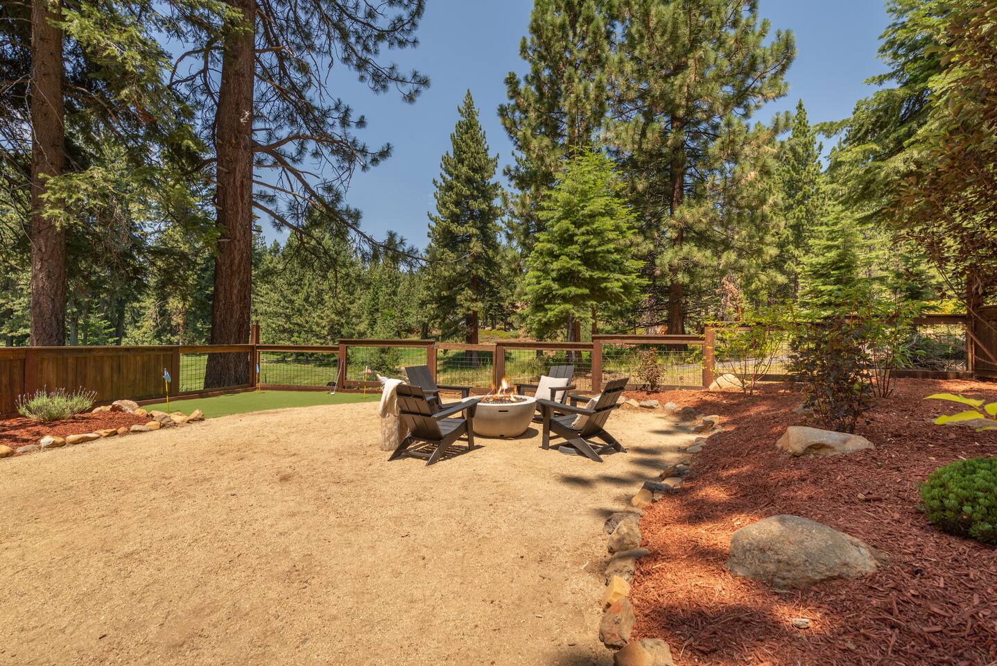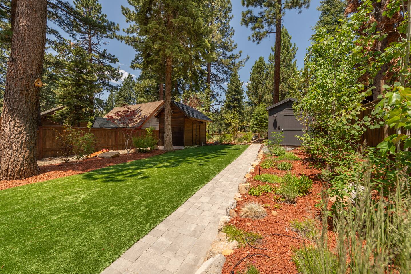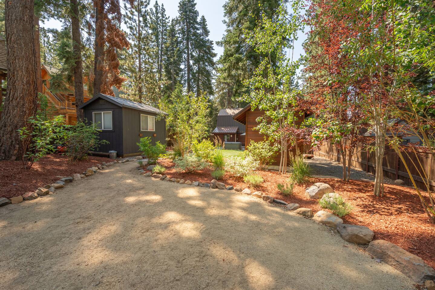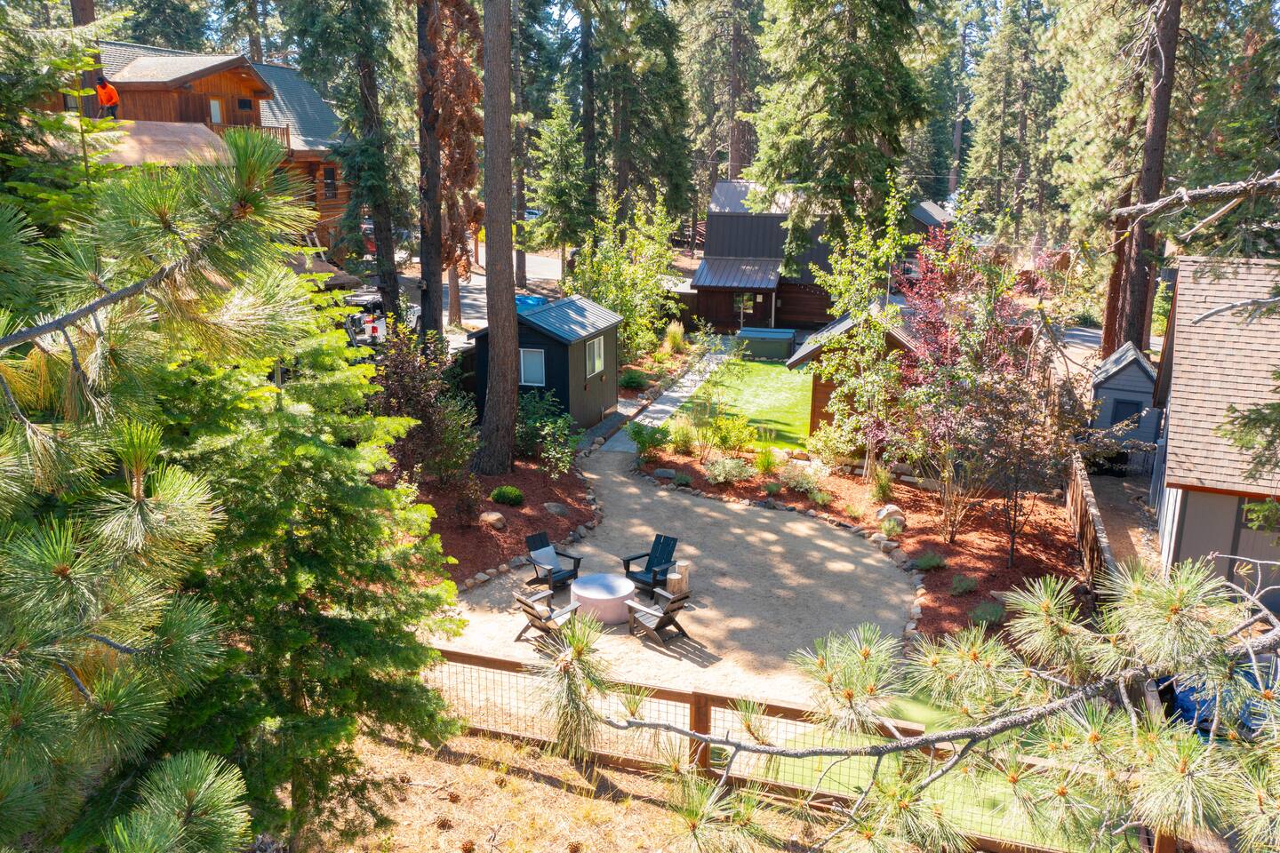 Our family lived in this home for 3.5 years as we remodeled it to prepare it for you, our guest. So there are the luxuries of a vacation rental with the comforts of a thoughtfully updated home. It was originally built in 1947 as a summer cabin on the golf course. Through landscaping and thoughtful updates, this home has been restored to its glory as an enjoyable cabin escape. The quarks of a small cabin are still there, such as VERY uneven floors and narrow staircase, but the comforts of modern living are tucked throughout, including an insulated Work-From-Home office Shed with full desk and cozy infrared space heater. Enter via the front door into the living room, or come around the back to the Mud Room with heated tile floors, washer and dryer, chest freezer, bench, custom shoe rack and plenty of outlets for your boot warmers. Enjoy the cozy living room with Samsung Frame TV (with high speed internet and ACCESS to all your favorite apps. You supply your own log ins, however) and modern gas stove (new in 2020). Dining at the West Elm table is most comfortable for two, but we also supply 2 folding chairs so that 4 people can dine together and a leaf for even more elbow room. The kitchen was fully remodeled in 2019 with quartz counters, full size dishwasher, gas range and giant toddler-bathtub-sized stainless steel sink. Custom uplighting in the open shelving allows you to show off your best wine or whiskey bottles. The under-counter double beverage fridges offer the same capacity as a normal sized fridge, but the small hassle of bending over is the trade off for wide open counter tops for pleasurable cooking prep. Please note that these refrigerators are technically beverage fridges, so they only get down to 39 degrees. They will keep your food safe to eat, but they will not keep veggies crisp as long as a traditional residential fridge will. We are a short walk to Safeway, so we recommend only buying the food you need for a few days at a time. The stairs to the second floor are narrow, but they have been carpeted for comfort and safety. Upstairs you will find both Queen bedrooms and a half bath we lovingly call a "luxury airline bathroom". It is small, but efficient and handy to have a toilet and sink upstairs near the bedrooms. Each room has a queen bed outfitted in comfortable linens. One bedroom has a TV, the other has a full glass sliding door to enjoy views of the snow falling in the neighborhood. Both rooms have blackout curtains for your comfort. Please note that the main heat source is the gas stove downstairs with the heat traveling up through the staircase into the bedrooms. One bedroom has a built in space heater so it can be heated when the door is closed, but the second room does not and will not be heated if the door is closed over night. The only full bathroom is found downstairs and while it is clean and functional, our little bathroom is where the 1940's really shine in this house. The shower is very small and can be a tight fit. Please see the photos in our listing of the shower to decide if it's a good fit for you. The handle is extended well overhead and the shampoo/conditioner/body wash are mounted to the wall to allow the maximum amount of space. We do have an instant hot water heater so at least you can take a nice long hot shower and won't use it all up for your housemates. The yard with hot tub, synthetic turf, putting green, dining area and gas fire pit with Adirondack chairs are a sight to behold. The fire pit and furniture is put away in winter, but we bring it back out as soon as the snow melts. Landscaping and fully enclosed fence were installed in the spring of 2021. Market lights hang over the hot tub for evening soaks, or shut them off for a sweeping view of stars. Please do not use the hot tub after 9pm quiet hours begin. The lawn is synthetic so it is guaranteed to be green and beautiful for your visit (or white and snowy!). The back portion of the yard is decomposed granite with a beautiful view of the 3rd hole and ladies tee of Brockway Golf Course as well as dining table, putting green and gas fire pit with Adirondack chairs (all put away in winter time when there is snow on the ground). The golf course is private property, but there is a gate for you to use if you are a guest of the golf course golfing and want to run into the property for a fresh cocktail :). Our private 3 hole putting green is the perfect spot to practice your putts before walking down to the nearby clubhouse for your tee time. Please note that we do not have a BBQ grill at this property. Also out in the yard is a large insulated Work-From-Home Shed Office. This space is an excellent spot to get "away" and get some work done. There is a large corner desk, comfortable office chair, space heater, wifi extender and plenty of outlets. In the summer, there is no Air Conditioning (pretty much anywhere in Tahoe, actually) so all your neighbors will have their windows open to enjoy the cool night air. That means that every whisper and sound you make outdoors at night carries into everyone's windows. Please respect quiet hours in our sweet, quiet neighborhood. There are fans in each bedroom and the home has new insulation in the roof so it will hold the cool night air through the daytime if you close the insulated curtains first thing in the morning. This same insulation helps keep the cabin cozy and snug through the winter months. We also provide HEPA air filters for the unfortunate "smoke season" we often experience in California. For those few weeks every year where it actually gets into the 80's during the day, it is still cool in the evenings, so the recommendation for Tahoe Cooling is to open all of the windows and shades at night to cool the house down, then close them in the morning to "trap" the cool air inside the house for the day. DOGS (please note: due to allergies we cannot accept any other type of pet): We welcome your pups here, but since this is first and foremost a house