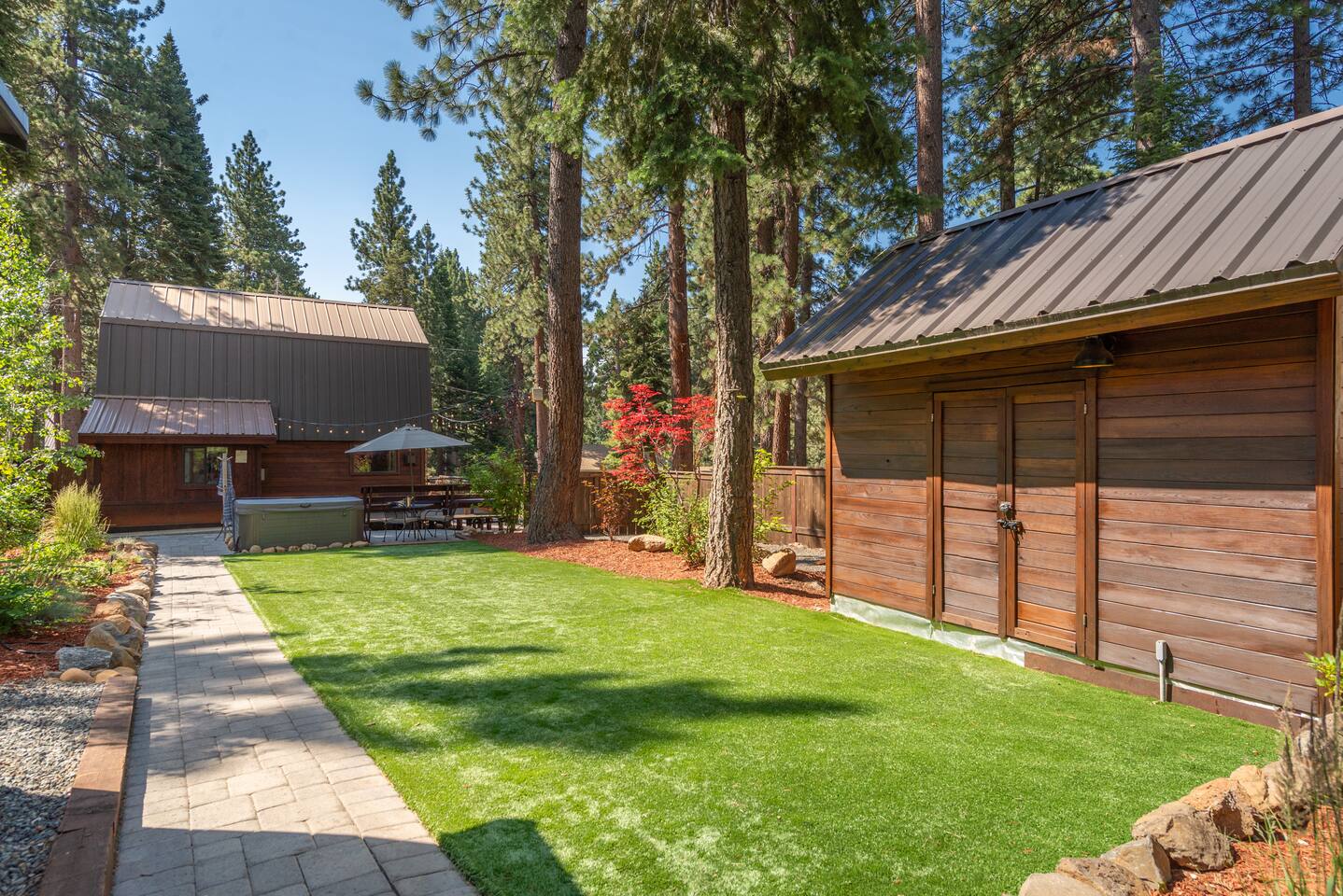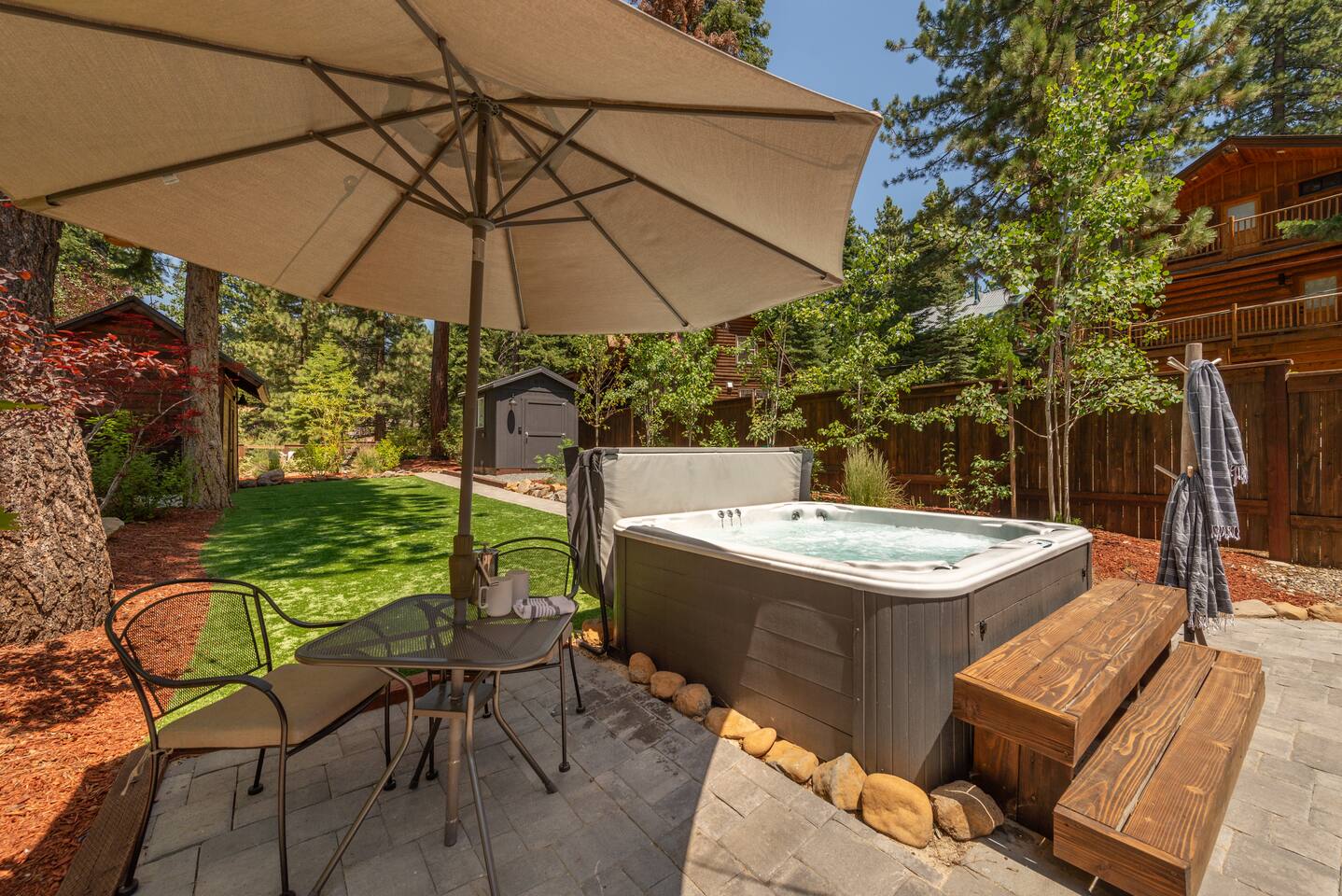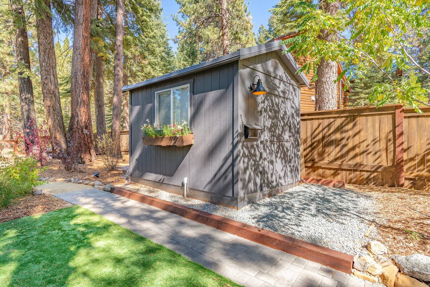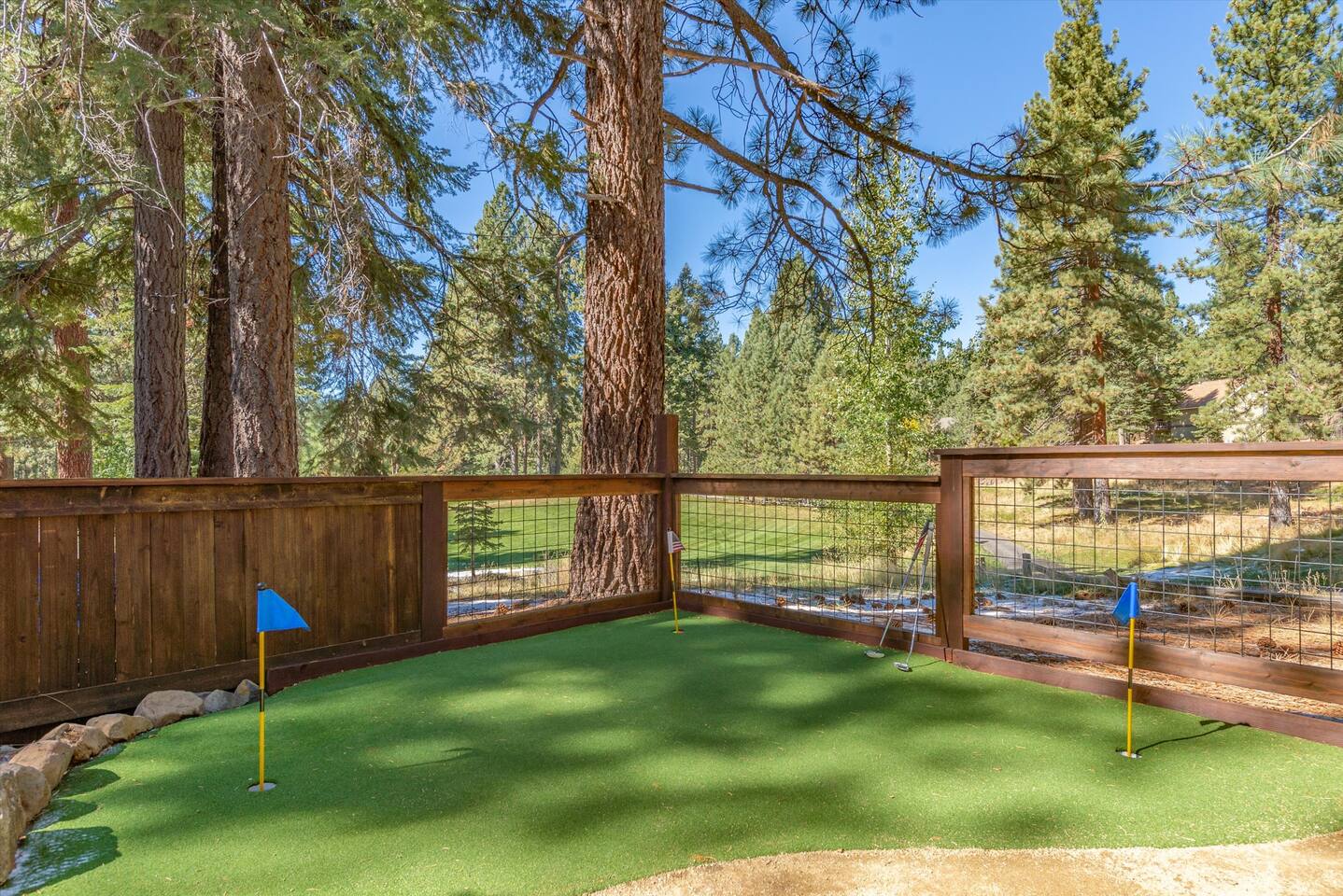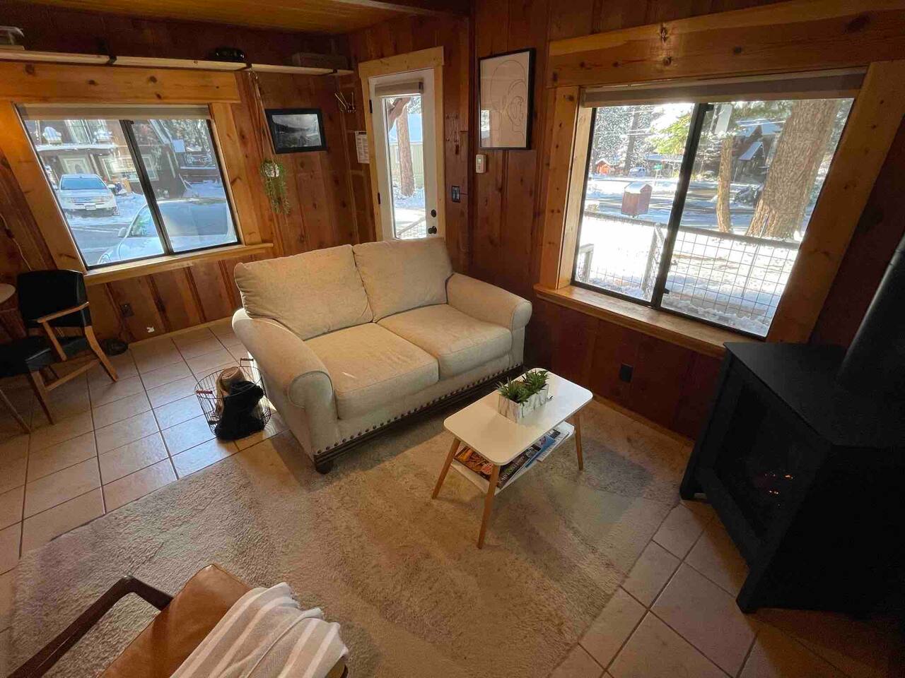 Our family lived in this home for 3.5 years as we remodeled it to prepare it for you, our guest. So there are the luxuries of a vacation rental with the comforts of a thoughtfully updated home. It was originally built in 1947 as a summer cabin on the golf course. Through landscaping and thoughtful updates, this home has been restored to its glory as an enjoyable cabin escape. The quarks of a small cabin are still there, such as VERY uneven floors and narrow staircase, but the comforts of modern living are tucked throughout, including an insulated Work-From-Home office Shed with full desk and cozy infrared space heater. Enter via the front door into the living room, or come around the back to the Mud Room with heated tile floors, washer and dryer, chest freezer, bench, custom shoe rack and plenty of outlets for your boot warmers. Enjoy the cozy living room with Samsung Frame TV (with high speed internet and ACCESS to all your favorite apps. You supply your own log ins, however) and modern gas stove (new in 2020). Dining at the West Elm table is most comfortable for two, but we also supply 2 folding chairs so that 4 people can dine together and a leaf for even more elbow room. The kitchen was fully remodeled in 2019 with quartz counters, full size dishwasher, gas range and giant toddler-bathtub-sized stainless steel sink. Custom uplighting in the open shelving allows you to show off your best wine or whiskey bottles. The under-counter double beverage fridges offer the same capacity as a normal sized fridge, but the small hassle of bending over is the trade off for wide open counter tops for pleasurable cooking prep. Please note that these refrigerators are technically beverage fridges, so they only get down to 39 degrees. They will keep your food safe to eat, but they will not keep veggies crisp as long as a traditional residential fridge will. We are a short walk to Safeway, so we recommend only buying the food you need for a few days at a time. The stairs to the second floor are narrow, but they have been carpeted for comfort and safety. Upstairs you will find both Queen bedrooms and a half bath we lovingly call a "luxury airline bathroom". It is small, but efficient and handy to have a toilet and sink upstairs near the bedrooms. Each room has a queen bed outfitted in comfortable linens. One bedroom has a TV, the other has a full glass sliding door to enjoy views of the snow falling in the neighborhood. Both rooms have blackout curtains for your comfort. Please note that the main heat source is the gas stove downstairs with the heat traveling up through the staircase into the bedrooms. One bedroom has a built in space heater so it can be heated when the door is closed, but the second room does not and will not be heated if the door is closed over night. The only full bathroom is found downstairs and while it is clean and functional, our little bathroom is where the 1940's really shine in this house. The shower is very small and can be a tight fit. Please see the photos in our listing of the shower to decide if it's a good fit for you. The handle is extended well overhead and the shampoo/conditioner/body wash are mounted to the wall to allow the maximum amount of space. We do have an instant hot water heater so at least you can take a nice long hot shower and won't use it all up for your housemates. The yard with hot tub, synthetic turf, putting green, dining area and gas fire pit with Adirondack chairs are a sight to behold. The fire pit and furniture is put away in winter, but we bring it back out as soon as the snow melts. Landscaping and fully enclosed fence were installed in the spring of 2021. Market lights hang over the hot tub for evening soaks, or shut them off for a sweeping view of stars. Please do not use the hot tub after 9pm quiet hours begin. The lawn is synthetic so it is guaranteed to be green and beautiful for your visit (or white and snowy!). The back portion of the yard is decomposed granite with a beautiful view of the 3rd hole and ladies tee of Brockway Golf Course as well as dining table, putting green and gas fire pit with Adirondack chairs (all put away in winter time when there is snow on the ground). The golf course is private property, but there is a gate for you to use if you are a guest of the golf course golfing and want to run into the property for a fresh cocktail :). Our private 3 hole putting green is the perfect spot to practice your putts before walking down to the nearby clubhouse for your tee time. Please note that we do not have a BBQ grill at this property. Also out in the yard is a large insulated Work-From-Home Shed Office. This space is an excellent spot to get "away" and get some work done. There is a large corner desk, comfortable office chair, space heater, wifi extender and plenty of outlets. In the summer, there is no Air Conditioning (pretty much anywhere in Tahoe, actually) so all your neighbors will have their windows open to enjoy the cool night air. That means that every whisper and sound you make outdoors at night carries into everyone's windows. Please respect quiet hours in our sweet, quiet neighborhood. There are fans in each bedroom and the home has new insulation in the roof so it will hold the cool night air through the daytime if you close the insulated curtains first thing in the morning. This same insulation helps keep the cabin cozy and snug through the winter months. We also provide HEPA air filters for the unfortunate "smoke season" we often experience in California. For those few weeks every year where it actually gets into the 80's during the day, it is still cool in the evenings, so the recommendation for Tahoe Cooling is to open all of the windows and shades at night to cool the house down, then close them in the morning to "trap" the cool air inside the house for the day. DOGS (please note: due to allergies we cannot accept any other type of pet): We welcome your pups here, but since this is first and foremost a house