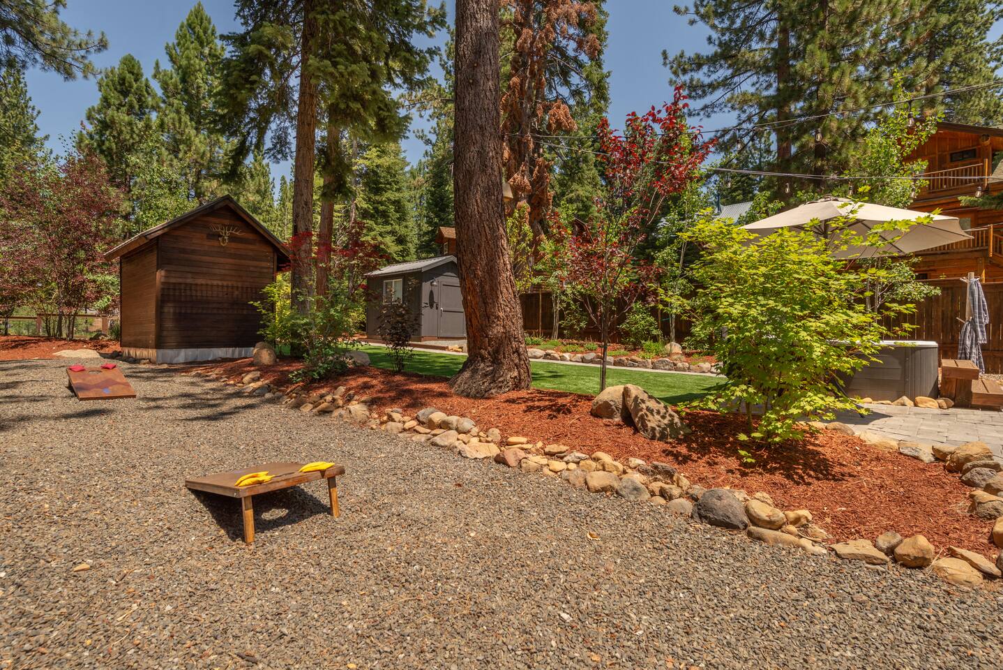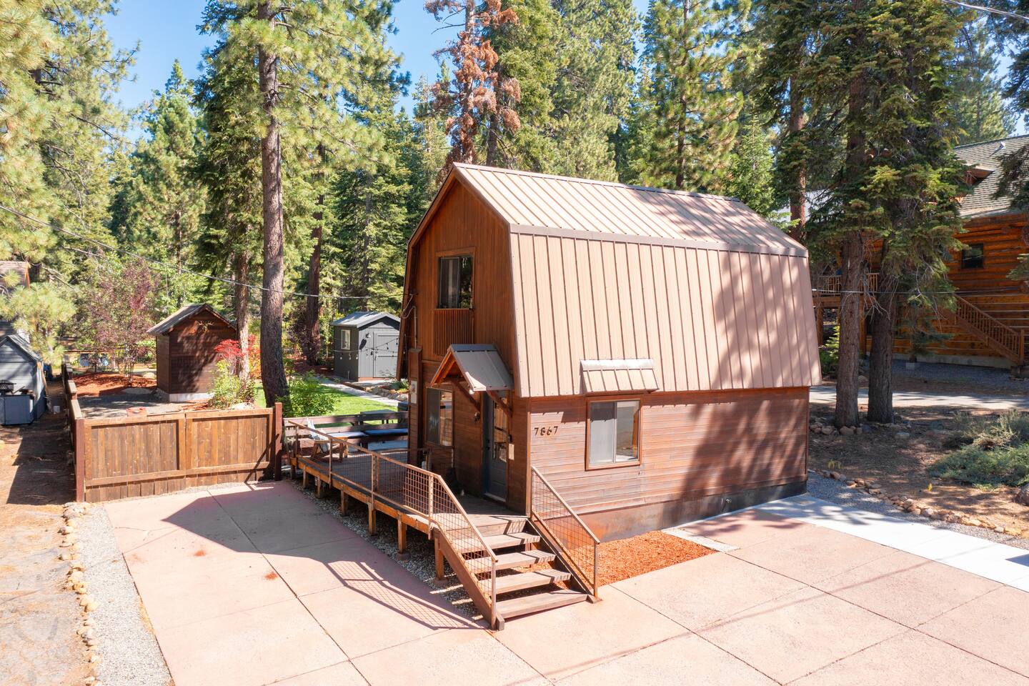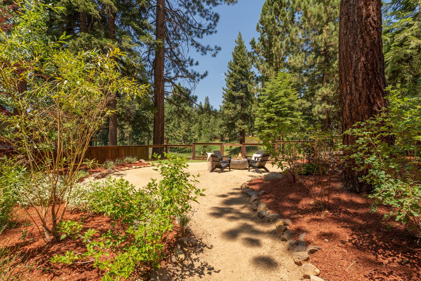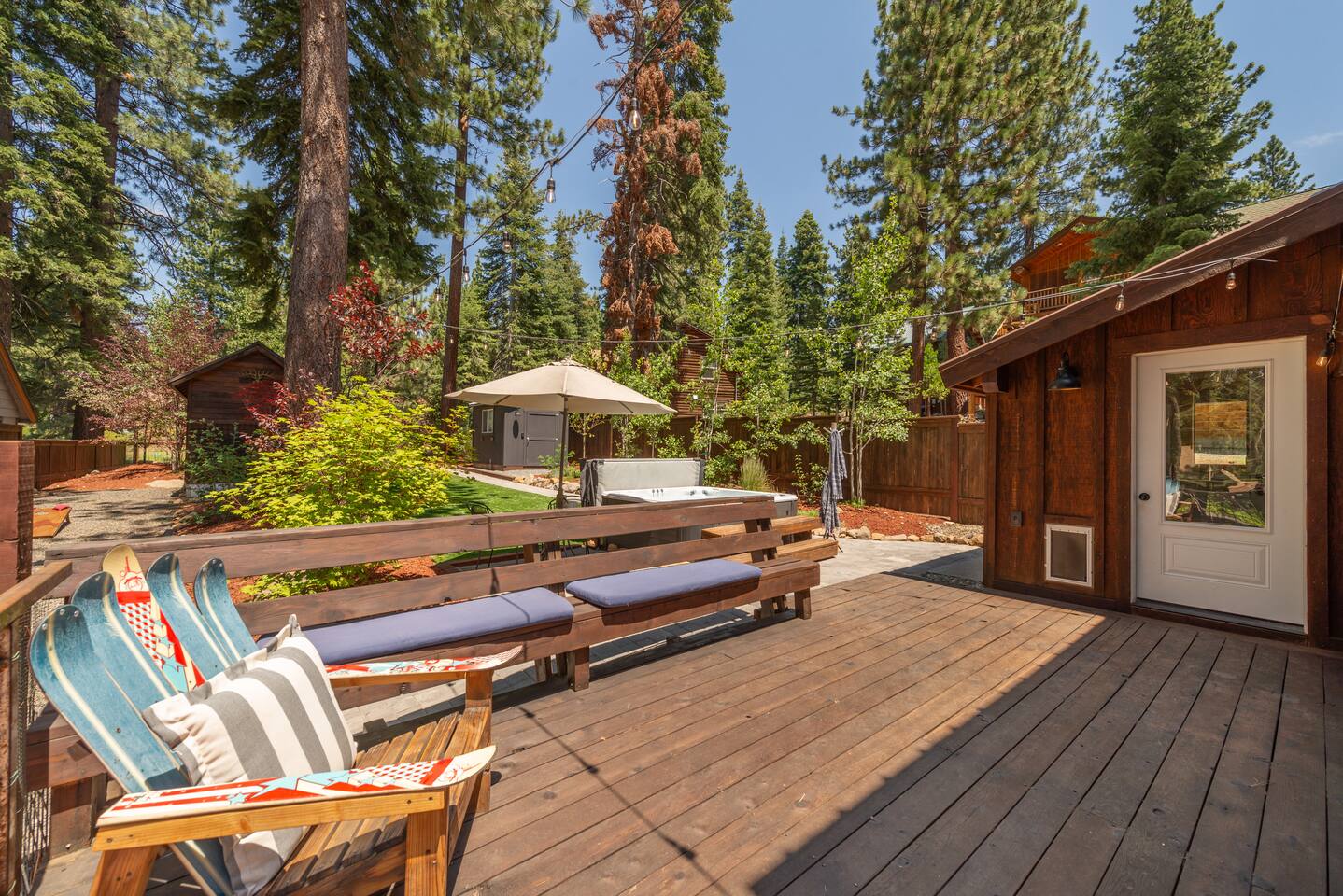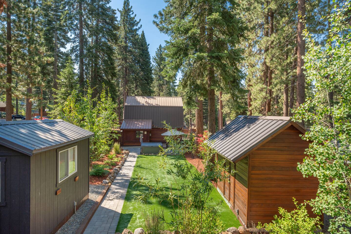 Our family lived in this home for 3.5 years as we remodeled it to prepare it for you, our guest. So there are the luxuries of a vacation rental with the comforts of a thoughtfully updated home. It was originally built in 1947 as a summer cabin on the golf course. Through landscaping and thoughtful updates, this home has been restored to its glory as an enjoyable cabin escape. The quarks of a small cabin are still there, such as VERY uneven floors and narrow staircase, but the comforts of modern living are tucked throughout, including an insulated Work-From-Home office Shed with full desk and cozy infrared space heater. Enter via the front door into the living room, or come around the back to the Mud Room with heated tile floors, washer and dryer, chest freezer, bench, custom shoe rack and plenty of outlets for your boot warmers. Enjoy the cozy living room with Samsung Frame TV (with high speed internet and ACCESS to all your favorite apps. You supply your own log ins, however) and modern gas stove (new in 2020). Dining at the West Elm table is most comfortable for two, but we also supply 2 folding chairs so that 4 people can dine together and a leaf for even more elbow room. The kitchen was fully remodeled in 2019 with quartz counters, full size dishwasher, gas range and giant toddler-bathtub-sized stainless steel sink. Custom uplighting in the open shelving allows you to show off your best wine or whiskey bottles. The under-counter double beverage fridges offer the same capacity as a normal sized fridge, but the small hassle of bending over is the trade off for wide open counter tops for pleasurable cooking prep. Please note that these refrigerators are technically beverage fridges, so they only get down to 39 degrees. They will keep your food safe to eat, but they will not keep veggies crisp as long as a traditional residential fridge will. We are a short walk to Safeway, so we recommend only buying the food you need for a few days at a time. The stairs to the second floor are narrow, but they have been carpeted for comfort and safety. Upstairs you will find both Queen bedrooms and a half bath we lovingly call a "luxury airline bathroom". It is small, but efficient and handy to have a toilet and sink upstairs near the bedrooms. Each room has a queen bed outfitted in comfortable linens. One bedroom has a TV, the other has a full glass sliding door to enjoy views of the snow falling in the neighborhood. Both rooms have blackout curtains for your comfort. Please note that the main heat source is the gas stove downstairs with the heat traveling up through the staircase into the bedrooms. One bedroom has a built in space heater so it can be heated when the door is closed, but the second room does not and will not be heated if the door is closed over night. The only full bathroom is found downstairs and while it is clean and functional, our little bathroom is where the 1940's really shine in this house. The shower is very small and can be a tight fit. Please see the photos in our listing of the shower to decide if it's a good fit for you. The handle is extended well overhead and the shampoo/conditioner/body wash are mounted to the wall to allow the maximum amount of space. We do have an instant hot water heater so at least you can take a nice long hot shower and won't use it all up for your housemates. The yard with hot tub, synthetic turf, putting green, dining area and gas fire pit with Adirondack chairs are a sight to behold. The fire pit and furniture is put away in winter, but we bring it back out as soon as the snow melts. Landscaping and fully enclosed fence were installed in the spring of 2021. Market lights hang over the hot tub for evening soaks, or shut them off for a sweeping view of stars. Please do not use the hot tub after 9pm quiet hours begin. The lawn is synthetic so it is guaranteed to be green and beautiful for your visit (or white and snowy!). The back portion of the yard is decomposed granite with a beautiful view of the 3rd hole and ladies tee of Brockway Golf Course as well as dining table, putting green and gas fire pit with Adirondack chairs (all put away in winter time when there is snow on the ground). The golf course is private property, but there is a gate for you to use if you are a guest of the golf course golfing and want to run into the property for a fresh cocktail :). Our private 3 hole putting green is the perfect spot to practice your putts before walking down to the nearby clubhouse for your tee time. Please note that we do not have a BBQ grill at this property. Also out in the yard is a large insulated Work-From-Home Shed Office. This space is an excellent spot to get "away" and get some work done. There is a large corner desk, comfortable office chair, space heater, wifi extender and plenty of outlets. In the summer, there is no Air Conditioning (pretty much anywhere in Tahoe, actually) so all your neighbors will have their windows open to enjoy the cool night air. That means that every whisper and sound you make outdoors at night carries into everyone's windows. Please respect quiet hours in our sweet, quiet neighborhood. There are fans in each bedroom and the home has new insulation in the roof so it will hold the cool night air through the daytime if you close the insulated curtains first thing in the morning. This same insulation helps keep the cabin cozy and snug through the winter months. We also provide HEPA air filters for the unfortunate "smoke season" we often experience in California. For those few weeks every year where it actually gets into the 80's during the day, it is still cool in the evenings, so the recommendation for Tahoe Cooling is to open all of the windows and shades at night to cool the house down, then close them in the morning to "trap" the cool air inside the house for the day. DOGS (please note: due to allergies we cannot accept any other type of pet): We welcome your pups here, but since this is first and foremost a house