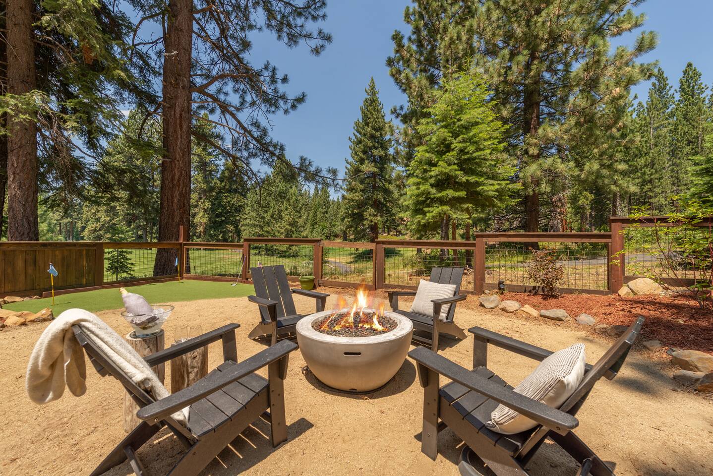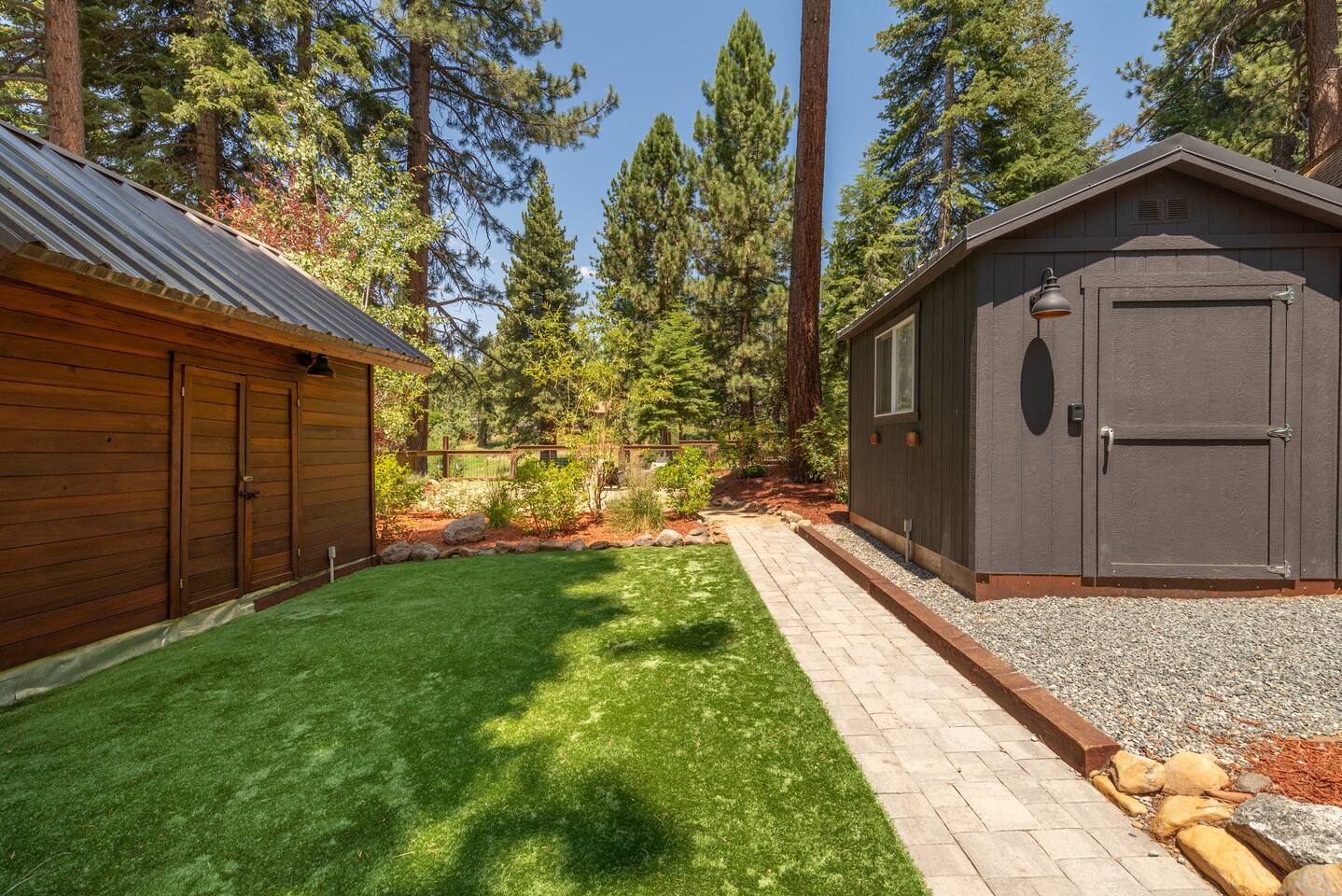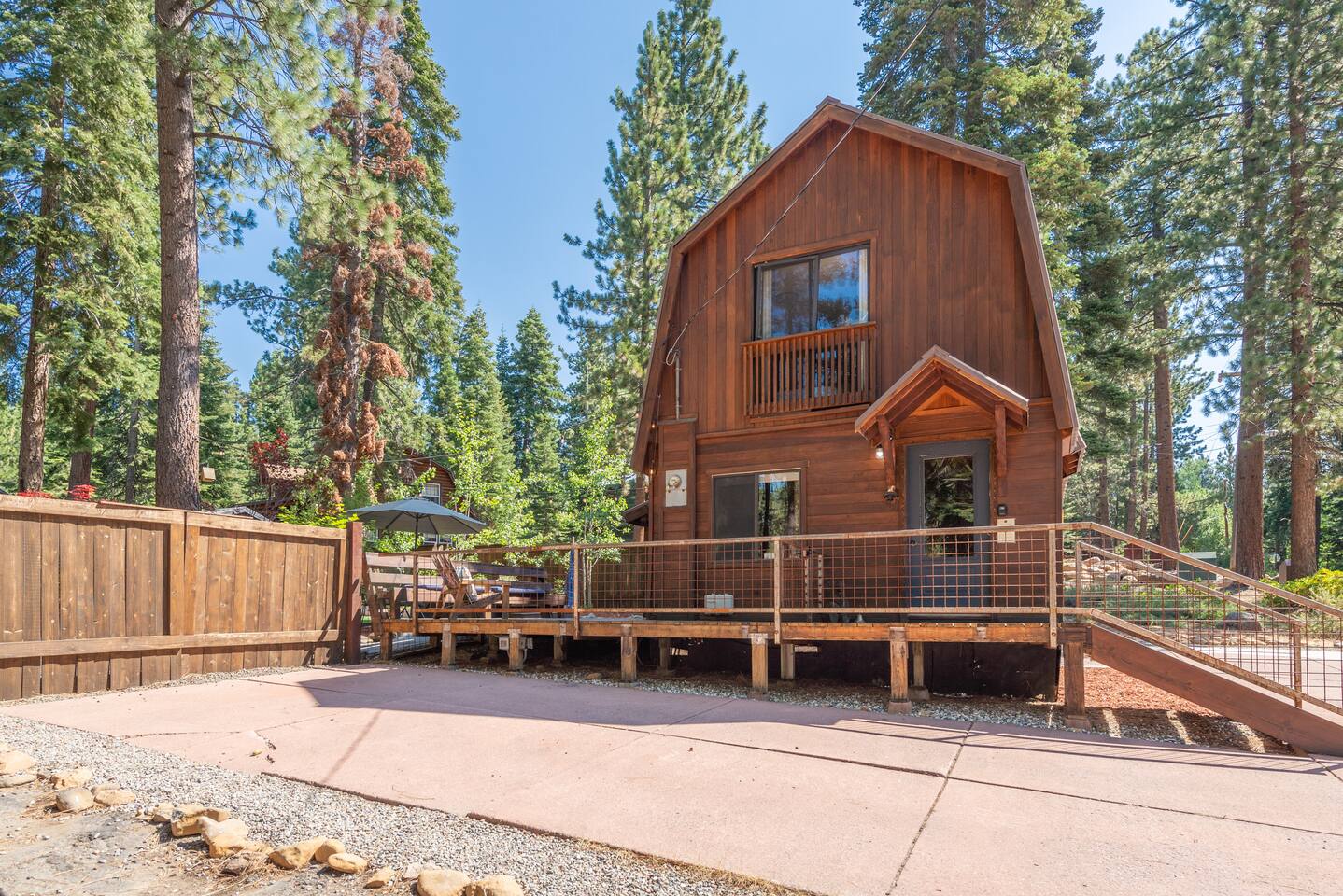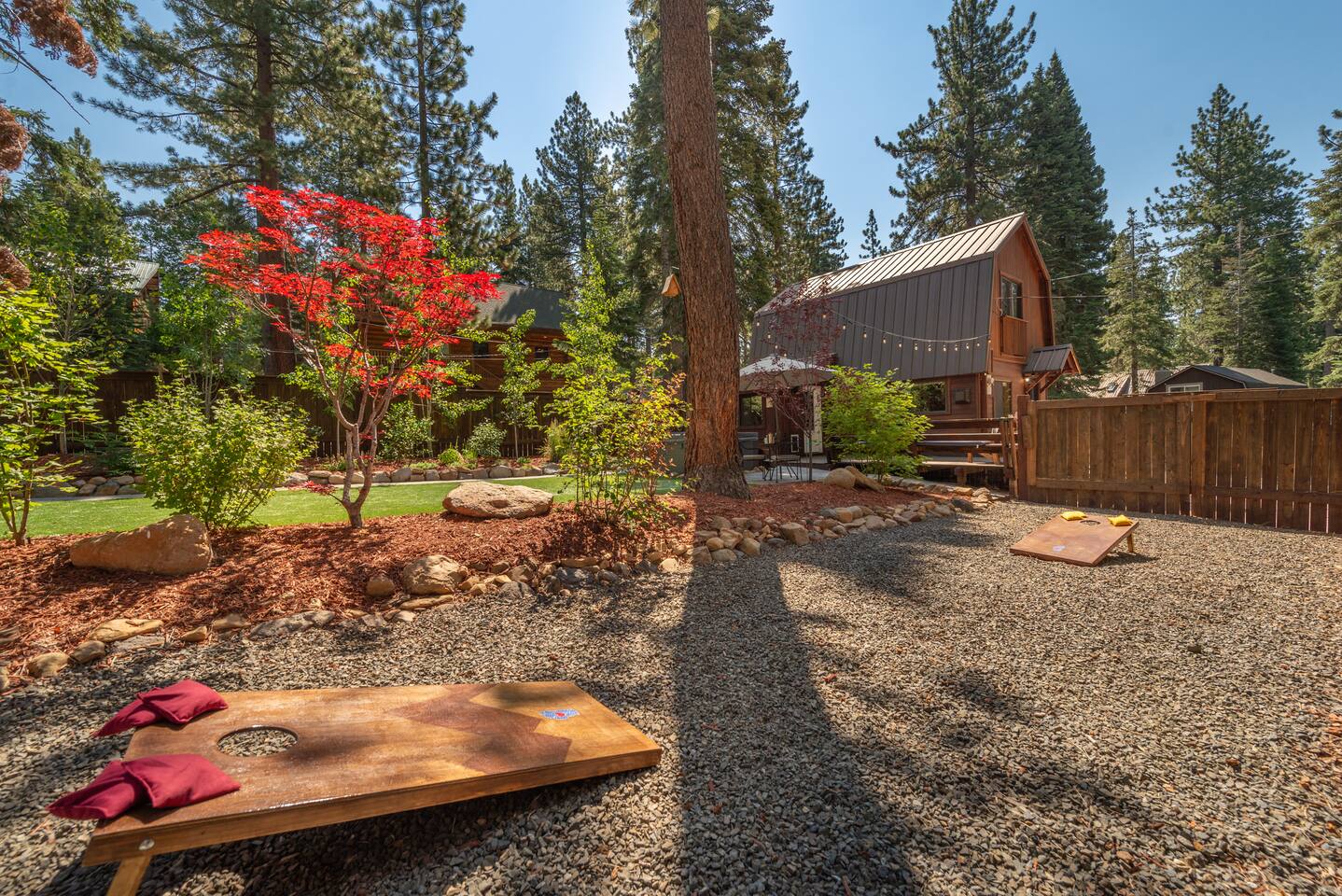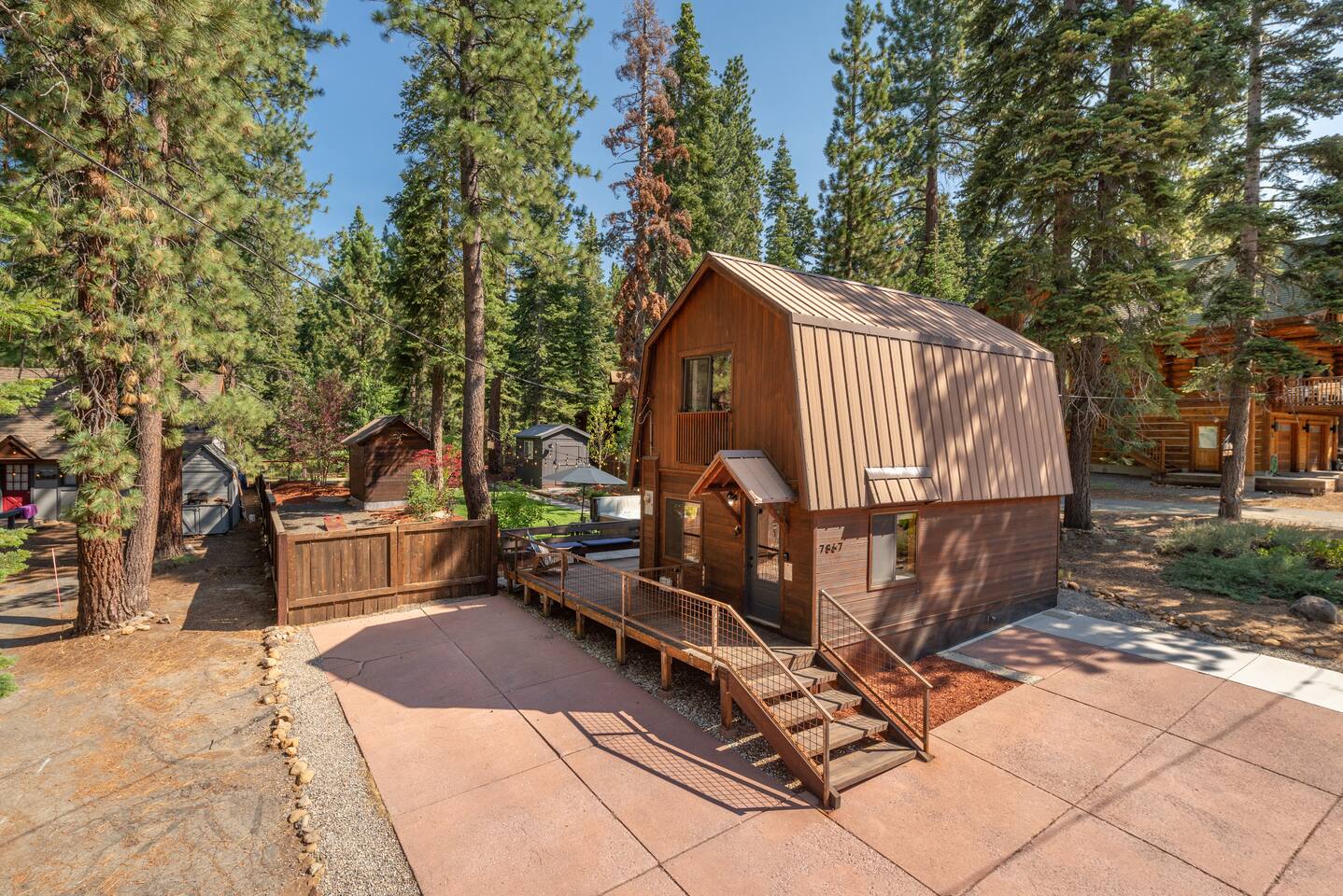Our family lived in this home for 3.5 years as we remodeled it to prepare it for you, our guest. So there are the luxuries of a vacation rental with the comforts of a thoughtfully updated home. It was originally built in 1947 as a summer cabin on the golf course. Through landscaping and thoughtful updates, this home has been restored to its glory as an enjoyable cabin escape. The quarks of a small cabin are still there, such as VERY uneven floors and narrow staircase, but the comforts of modern living are tucked throughout, including an insulated Work-From-Home office Shed with full desk and cozy infrared space heater. Enter via the front door into the living room, or come around the back to the Mud Room with heated tile floors, washer and dryer, chest freezer, bench, custom shoe rack and plenty of outlets for your boot warmers. Enjoy the cozy living room with Samsung Frame TV (with high speed internet and ACCESS to all your favorite apps. You supply your own log ins, however) and modern gas stove (new in 2020). Dining at the West Elm table is most comfortable for two, but we also supply 2 folding chairs so that 4 people can dine together and a leaf for even more elbow room. The kitchen was fully remodeled in 2019 with quartz counters, full size dishwasher, gas range and giant toddler-bathtub-sized stainless steel sink. Custom uplighting in the open shelving allows you to show off your best wine or whiskey bottles. The under-counter double beverage fridges offer the same capacity as a normal sized fridge, but the small hassle of bending over is the trade off for wide open counter tops for pleasurable cooking prep. Please note that these refrigerators are technically beverage fridges, so they only get down to 39 degrees. They will keep your food safe to eat, but they will not keep veggies crisp as long as a traditional residential fridge will. We are a short walk to Safeway, so we recommend only buying the food you need for a few days at a time. The stairs to the second floor are narrow, but they have been carpeted for comfort and safety. Upstairs you will find both Queen bedrooms and a half bath we lovingly call a "luxury airline bathroom". It is small, but efficient and handy to have a toilet and sink upstairs near the bedrooms. Each room has a queen bed outfitted in comfortable linens. One bedroom has a TV, the other has a full glass sliding door to enjoy views of the snow falling in the neighborhood. Both rooms have blackout curtains for your comfort. Please note that the main heat source is the gas stove downstairs with the heat traveling up through the staircase into the bedrooms. One bedroom has a built in space heater so it can be heated when the door is closed, but the second room does not and will not be heated if the door is closed over night. The only full bathroom is found downstairs and while it is clean and functional, our little bathroom is where the 1940's really shine in this house. The shower is very small and can be a tight fit. Please see the photos in our listing of the shower to decide if it's a good fit for you. The handle is extended well overhead and the shampoo/conditioner/body wash are mounted to the wall to allow the maximum amount of space. We do have an instant hot water heater so at least you can take a nice long hot shower and won't use it all up for your housemates. The yard with hot tub, synthetic turf, putting green, dining area and gas fire pit with Adirondack chairs are a sight to behold. The fire pit and furniture is put away in winter, but we bring it back out as soon as the snow melts. Landscaping and fully enclosed fence were installed in the spring of 2021. Market lights hang over the hot tub for evening soaks, or shut them off for a sweeping view of stars. Please do not use the hot tub after 9pm quiet hours begin. The lawn is synthetic so it is guaranteed to be green and beautiful for your visit (or white and snowy!). The back portion of the yard is decomposed granite with a beautiful view of the 3rd hole and ladies tee of Brockway Golf Course as well as dining table, putting green and gas fire pit with Adirondack chairs (all put away in winter time when there is snow on the ground). The golf course is private property, but there is a gate for you to use if you are a guest of the golf course golfing and want to run into the property for a fresh cocktail :). Our private 3 hole putting green is the perfect spot to practice your putts before walking down to the nearby clubhouse for your tee time. Please note that we do not have a BBQ grill at this property. Also out in the yard is a large insulated Work-From-Home Shed Office. This space is an excellent spot to get "away" and get some work done. There is a large corner desk, comfortable office chair, space heater, wifi extender and plenty of outlets. In the summer, there is no Air Conditioning (pretty much anywhere in Tahoe, actually) so all your neighbors will have their windows open to enjoy the cool night air. That means that every whisper and sound you make outdoors at night carries into everyone's windows. Please respect quiet hours in our sweet, quiet neighborhood. There are fans in each bedroom and the home has new insulation in the roof so it will hold the cool night air through the daytime if you close the insulated curtains first thing in the morning. This same insulation helps keep the cabin cozy and snug through the winter months. We also provide HEPA air filters for the unfortunate "smoke season" we often experience in California. For those few weeks every year where it actually gets into the 80's during the day, it is still cool in the evenings, so the recommendation for Tahoe Cooling is to open all of the windows and shades at night to cool the house down, then close them in the morning to "trap" the cool air inside the house for the day. DOGS (please note: due to allergies we cannot accept any other type of pet): We welcome your pups here, but since this is first and foremost a house