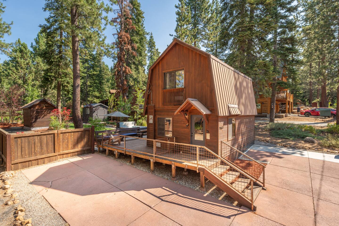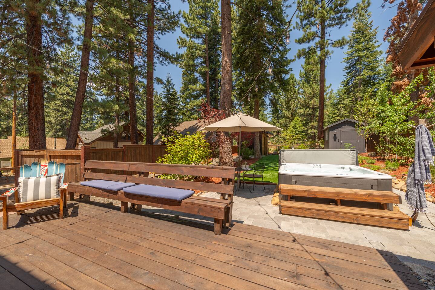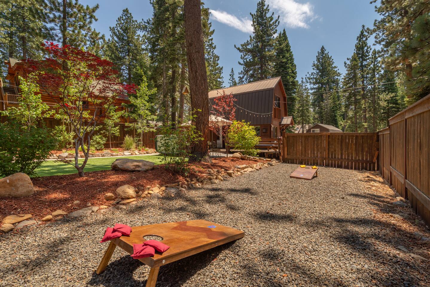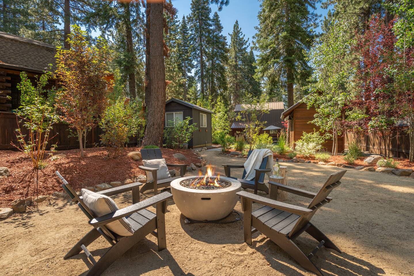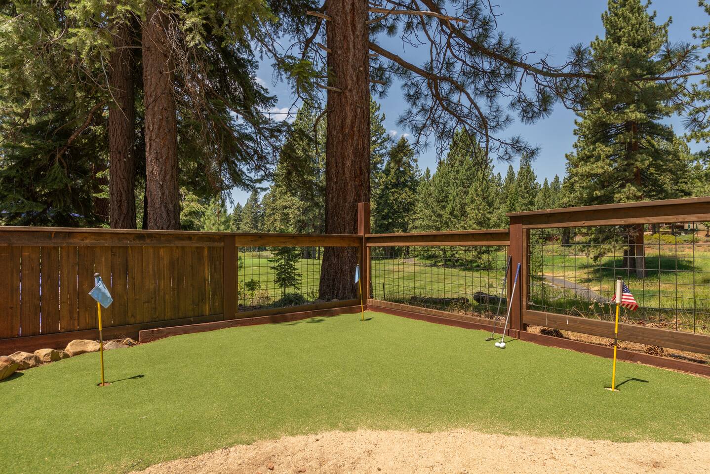 Our family lived in this home for 3.5 years as we remodeled it to prepare it for you, our guest. So there are the luxuries of a vacation rental with the comforts of a thoughtfully updated home. It was originally built in 1947 as a summer cabin on the golf course. Through landscaping and thoughtful updates, this home has been restored to its glory as an enjoyable cabin escape. The quarks of a small cabin are still there, such as VERY uneven floors and narrow staircase, but the comforts of modern living are tucked throughout, including an insulated Work-From-Home office Shed with full desk and cozy infrared space heater. Enter via the front door into the living room, or come around the back to the Mud Room with heated tile floors, washer and dryer, chest freezer, bench, custom shoe rack and plenty of outlets for your boot warmers. Enjoy the cozy living room with Samsung Frame TV (with high speed internet and ACCESS to all your favorite apps. You supply your own log ins, however) and modern gas stove (new in 2020). Dining at the West Elm table is most comfortable for two, but we also supply 2 folding chairs so that 4 people can dine together and a leaf for even more elbow room. The kitchen was fully remodeled in 2019 with quartz counters, full size dishwasher, gas range and giant toddler-bathtub-sized stainless steel sink. Custom uplighting in the open shelving allows you to show off your best wine or whiskey bottles. The under-counter double beverage fridges offer the same capacity as a normal sized fridge, but the small hassle of bending over is the trade off for wide open counter tops for pleasurable cooking prep. Please note that these refrigerators are technically beverage fridges, so they only get down to 39 degrees. They will keep your food safe to eat, but they will not keep veggies crisp as long as a traditional residential fridge will. We are a short walk to Safeway, so we recommend only buying the food you need for a few days at a time. The stairs to the second floor are narrow, but they have been carpeted for comfort and safety. Upstairs you will find both Queen bedrooms and a half bath we lovingly call a "luxury airline bathroom". It is small, but efficient and handy to have a toilet and sink upstairs near the bedrooms. Each room has a queen bed outfitted in comfortable linens. One bedroom has a TV, the other has a full glass sliding door to enjoy views of the snow falling in the neighborhood. Both rooms have blackout curtains for your comfort. Please note that the main heat source is the gas stove downstairs with the heat traveling up through the staircase into the bedrooms. One bedroom has a built in space heater so it can be heated when the door is closed, but the second room does not and will not be heated if the door is closed over night. The only full bathroom is found downstairs and while it is clean and functional, our little bathroom is where the 1940's really shine in this house. The shower is very small and can be a tight fit. Please see the photos in our listing of the shower to decide if it's a good fit for you. The handle is extended well overhead and the shampoo/conditioner/body wash are mounted to the wall to allow the maximum amount of space. We do have an instant hot water heater so at least you can take a nice long hot shower and won't use it all up for your housemates. The yard with hot tub, synthetic turf, putting green, dining area and gas fire pit with Adirondack chairs are a sight to behold. The fire pit and furniture is put away in winter, but we bring it back out as soon as the snow melts. Landscaping and fully enclosed fence were installed in the spring of 2021. Market lights hang over the hot tub for evening soaks, or shut them off for a sweeping view of stars. Please do not use the hot tub after 9pm quiet hours begin. The lawn is synthetic so it is guaranteed to be green and beautiful for your visit (or white and snowy!). The back portion of the yard is decomposed granite with a beautiful view of the 3rd hole and ladies tee of Brockway Golf Course as well as dining table, putting green and gas fire pit with Adirondack chairs (all put away in winter time when there is snow on the ground). The golf course is private property, but there is a gate for you to use if you are a guest of the golf course golfing and want to run into the property for a fresh cocktail :). Our private 3 hole putting green is the perfect spot to practice your putts before walking down to the nearby clubhouse for your tee time. Please note that we do not have a BBQ grill at this property. Also out in the yard is a large insulated Work-From-Home Shed Office. This space is an excellent spot to get "away" and get some work done. There is a large corner desk, comfortable office chair, space heater, wifi extender and plenty of outlets. In the summer, there is no Air Conditioning (pretty much anywhere in Tahoe, actually) so all your neighbors will have their windows open to enjoy the cool night air. That means that every whisper and sound you make outdoors at night carries into everyone's windows. Please respect quiet hours in our sweet, quiet neighborhood. There are fans in each bedroom and the home has new insulation in the roof so it will hold the cool night air through the daytime if you close the insulated curtains first thing in the morning. This same insulation helps keep the cabin cozy and snug through the winter months. We also provide HEPA air filters for the unfortunate "smoke season" we often experience in California. For those few weeks every year where it actually gets into the 80's during the day, it is still cool in the evenings, so the recommendation for Tahoe Cooling is to open all of the windows and shades at night to cool the house down, then close them in the morning to "trap" the cool air inside the house for the day. DOGS (please note: due to allergies we cannot accept any other type of pet): We welcome your pups here, but since this is first and foremost a house